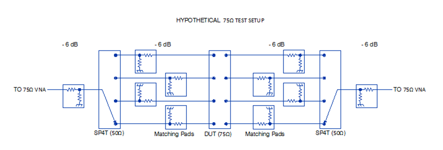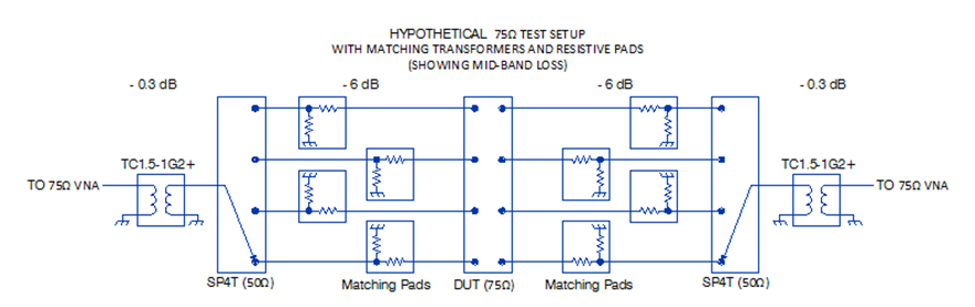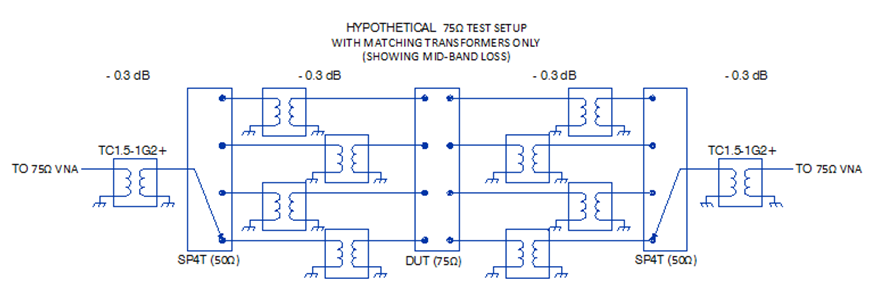 איורים 1 עד 3 מראים שלושה מערכי בדיקה היפותטיים ל- Ω75, אשר משתמשים בשני מתגים מסוג SP4T לניתוב אותות אל חיבורי port של היחידה הנמצאת בבדיקה. את המערך אפשר לממש בפועל בעזרת תיבות מיתוג RC-2SP4T-A18 של Mini-Circuits  מבוקרות דרך USB / Ethernet. באיור 1, המתגים SP4T ל- Ω50  מוכנסים בעזרת שימוש ברשתות תיאום התנגדותיות. ההפסדים במערך זה, נוסף על הפסדי המעבר של המתגים, הם 24 dB בערך, עלולים להיות בעייתים מהסיבות שהוסברו לעיל. לחלופין, אנו יכולים להקטין את ההפסדים האלו ביותר מ- 22 dB, פקטור של כ- 160, על ידי החלפה של רשתות התיאום ההתנגדותיות, בשנאי תיאום עכבה (אימפדאנס) עם הפסדים נמוכים, כפי שנראה באיור 2. כל החלפה של רשת תיאום בשנאי חוסכת עד 5.7 dB של הפסדי מעבר באמצע רוחב הפס וכ- 4.7 dB בקצות רוחב הפס (בתלות בדגם של השנאי שייבחר).