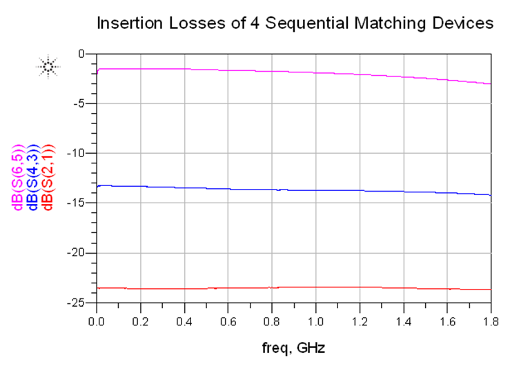 איור 4. הדמיה של הפסדי המעבר של ארבעה שנאים (הקו הוורוד), שני שנאים ושתי רשתות התנגדותיות (הקו הכחול) וארבע רשתות התנגדותיות (הקו האדום).