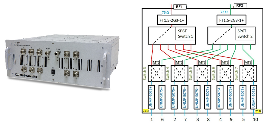 איור 2. מערך בדיקה ל- Ω75 שמשתמש בשני מתגי SP4T ל- Ω50 עם שנאי תיאום בלבד