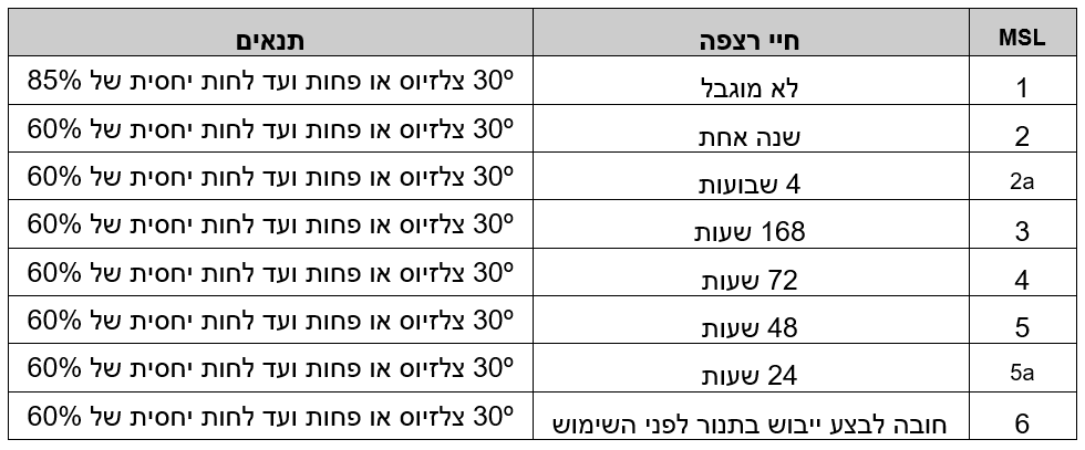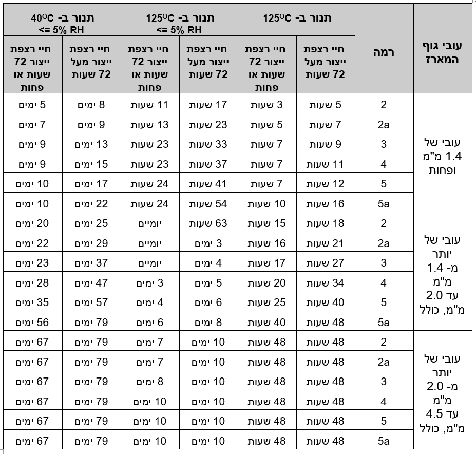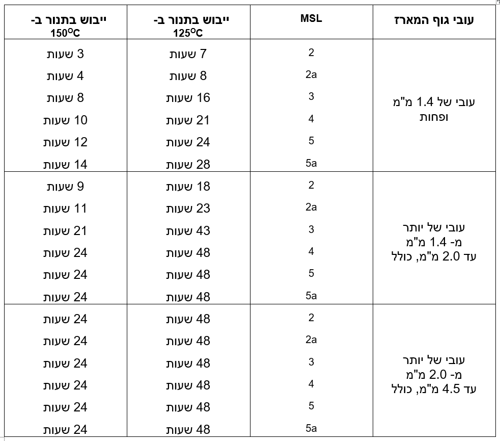 טבלה 2 בהמשך מציגה את אמות המידה והתנאים לייבוש בתנור.