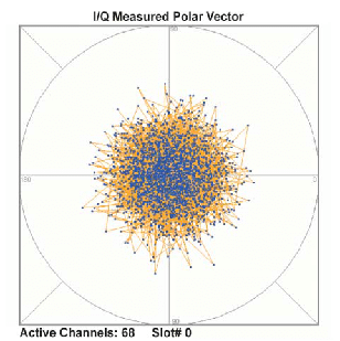 In making these measurements, the analyzer creates a reference signal by demodulating the measured signal and recovering the intended symbols. It then mathematically re-modulates the signal to create an ideal reference. EVM is the resulting vector between the two, representing both the amplitude and phase errors. Typically it is expressed as a percentage of the peak ideal signal. For signals such as CDMA, OFDM or QAM, the measured signal is represented in an I/Q polar graph or constellation diagram, as in figure 1, and the EVM is a calculated value.