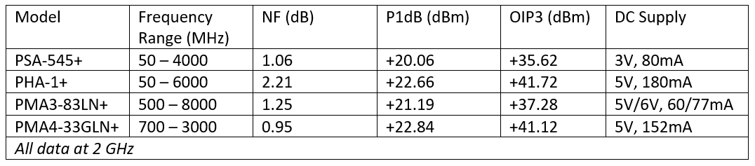 Mini-Circuits lineup of low-noise, high-dynamic-range, MMIC amplifiers includes over 30 unique models in the PSA, PMA and PHA families. These are broadband, single stage, Class A, 50Ω MMIC amplifiers. All offer outstanding noise figure and intermodulation performance. The most recent additions to the PMA family are distinguished through their low noise performance over multi-octave bandwidths and high IP3 performance with low DC power consumption. Table 1 shows key performance parameters for selected models in these amplifier families.