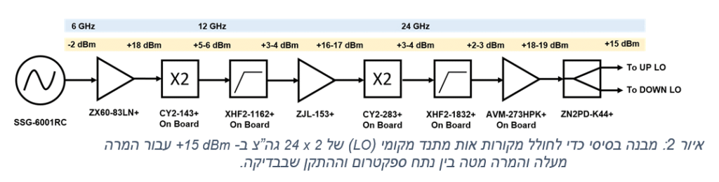 ערבל התדר MDB-44H+ פועל על מתנד מקומי (LO) עם רמה של +15 dBm, כך שמקור אות המתנד המקומי אמור לספק שני ערוצים של 24 גה”צ ב- +15 dBm. איור 2 מציג מבנה בסיסי שמשתמש ברכיבים של Mini-Circuits המחוברים ביניהם, כדי להכפיל אות מסונתז של 6 גה”צ שמגיע ממחולל האותות עד ל- 24 גה”צ. לתיקון רמות האות משתמשים במגברים קואקסיאליים. מסננים ללא החזרות המדכאים הרמוניות בלתי רצויות ביציאת מכפל התדר ובולעים את כל ההחזרות של האותות המופיעות בין מרכיבי השרשרת, והתקן מפצל/מרבב בעל פס רחב במיוחד המשמש לחלוקה שלאות בתדר 24 גה”צ לכל אחד משני חיבורי המתנד המקומי של ערבל התדר.