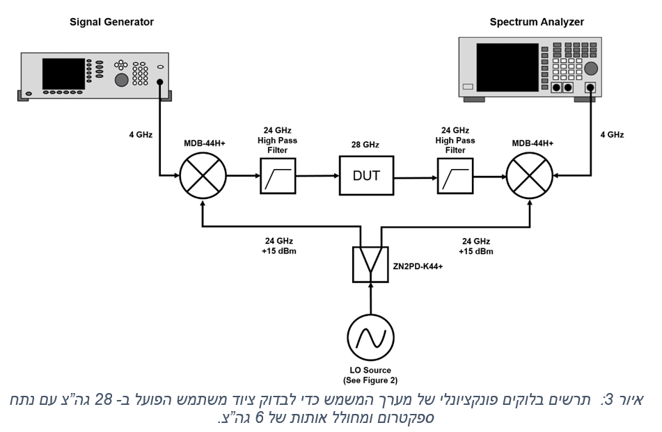 כעת, לאחר שיש לנו האמצעים להמרת תדר בין 4 גה”צ ל-28 גה”צ ומקור של 24 גה”צ עבור המתנד המקומי (LO) של ערבל התדר, אנו יכולים לשלב את המרכיבים האלו כדי לבנות מבחר של מערכים שימושיים. דוגמה אחת היא מערך מדידה עם נתח ספקטרום שמתואר באיור 3.