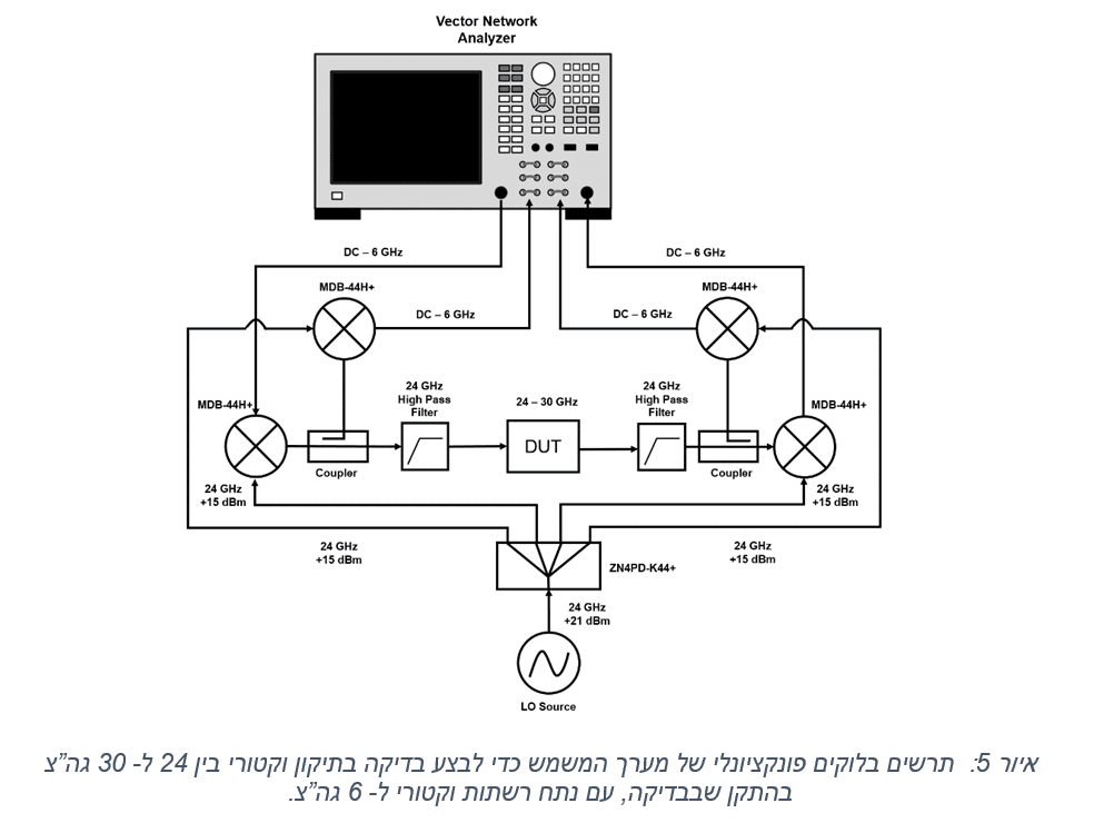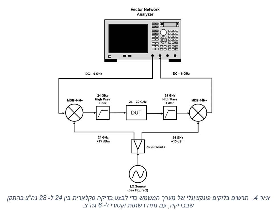 איור 5 מציג מערך כזה עם יכולות מלאות של כיול ומדידה של וקטורים. שים לב שבמקרה זה אנו משתמשים במפצל 4 דרך ל- 40 גה”צ, ויש צורך במקור אות מתנד מקומי (LO) של 24 גה”צ עם הספק של +21 dBm על מנת לחלק את אות המתנד המקומי ל- 4 ערוצים. המצמדים אמורים לפעול בטווח שבין 24 עד 30 גה”צ עם יחס צימוד של 20 dB בערך, כדי לחצוץ בצורה תקינה את חוסר התיאום בנתיב של המקלט. חברת Mini-Circuits מפתחת עתה מצמדים עם טווח תדירויות מ- 20 עד 40 גה”צ שמתאימים במיוחד ליישום זה.