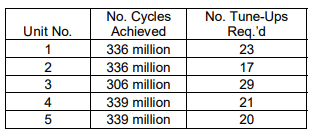 Table 4: Cumulative number of cycles completed (in millions) prior to each tune-up.