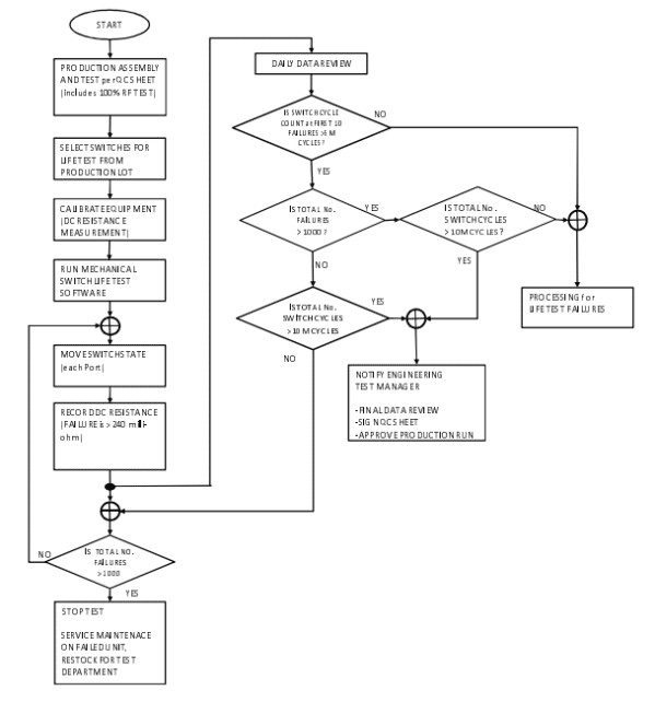 It is a Mini-Circuits internal quality requirement that each production lot of mechanical RF switches be subjected to sample life testing prior to lot acceptance. On each production lot, a minimum of two (2) switches are randomly selected and subjected to the same DC life test as outlined above. All units are required to pass the First Failure and the Cumulative Failure criteria for lot acceptance. Data is recorded on all lots and a sample summary is included herein.