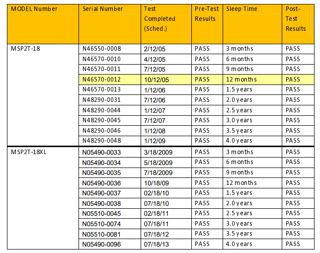 Production Life Test data is used in this report as basis for life testing. (referred herein in TEST 1: Life Testing – without tune-up).