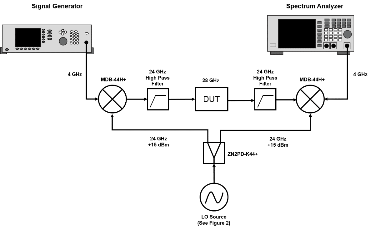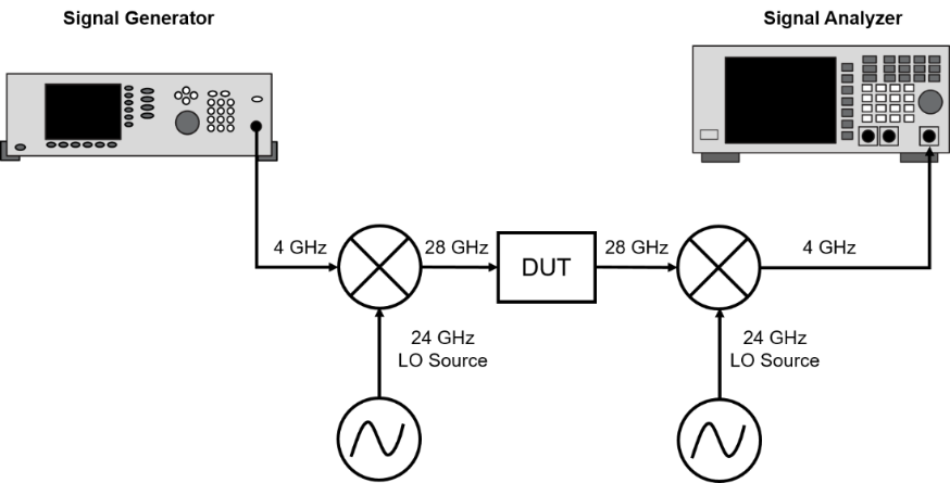 Let’s assume for our case that we want to assemble a test setup for uplink and downlink testing of 28 GHz DUTs using a spectrum analyzer and a signal source (synthesizer or signal generator), both with operating frequencies up to 6 GHz. For downlink testing, a wideband mixer with an LO frequency of 24 GHz can be used to convert a 4 GHz test signal from the signal generator to 28 GHz to the DUT. For uplink testing, the same mixer can be used to convert 28 GHz from the DUT back down to 4 GHz into the analyzer.
