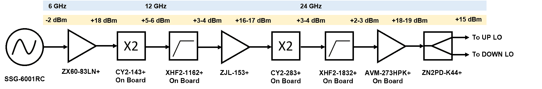 Note that this block diagram represents a concept that may be modified to the user’s requirements. Depending on the user’s actual application frequency, real-world losses and parasitic effects, different combinations of multipliers, filters, amplifiers and attenuators may be added to the chain to achieve the ideal signal frequency and power.
