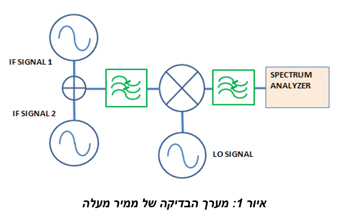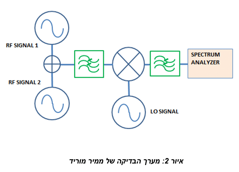לצורך השוואה, בוצעו בדיקות של אפנון ביניים בשני אותות בתצורה של ממיר מעלה באמצעות ערבלים מבוססי דיודות עם מגוון של מסננים בחיבורי כניסות התב”מ (תדר ביניים – IF) וביציאות הת”ר (תדר רדיו – RF). מדידות של אפנון הביניים מסדר שלישי בוצעו עם כניסת תדר ביניים של 150 מגה הרץ ובמרווחים של 1 מגה הרץ בין שני האותות וביציאות ת”ר של 800 מגה הרץ ו- 2,200 מגה הרץ. מערך הבדיקה מתואר באיור 1, ותנאי הבדיקה מסוכמים בטבלה 1.