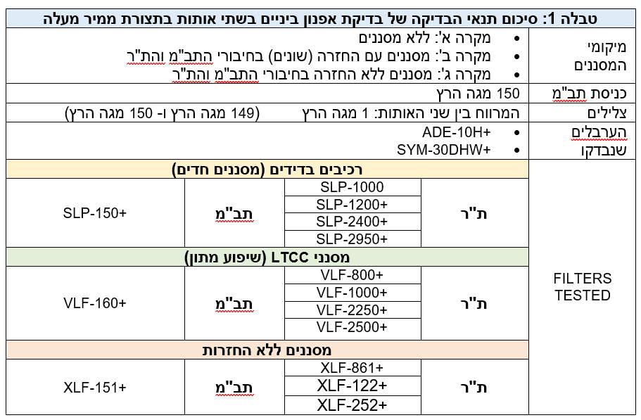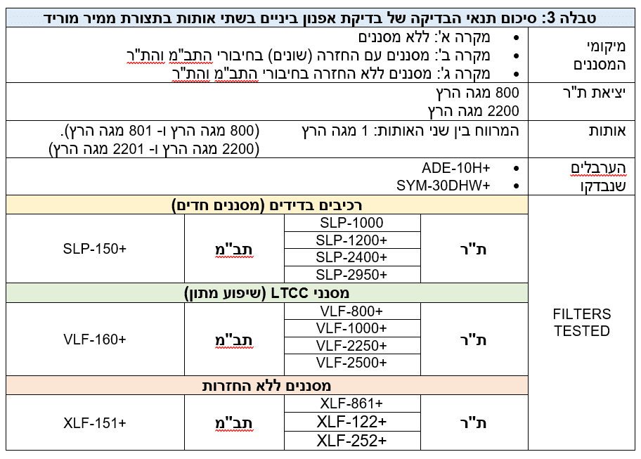 ראוי לשים לב, שבכל המקרים שבהם נעשה שימוש במסננים עם החזרה, המסננים תרמו לעלייה משמעותית במכפלת אפנון הביניים מסדר שלישי (IM 3) ביחס למכפלת IM 3 של הערבל שבו לא שימשו מסננים כלל וכלל. עם זאת, כאשר נעשה שימוש במסננים ללא החזרות, מכפלת IM 3 שנמדדה הייתה שווה כמעט לזו שנמדדה בערבל לבדו או נמוכה מממנה. לכן, תוצאות אלו מוכיחות שהשימוש במסננים ללא החזרות במעגלי ממירים מעלים מביא לשיפור בביצועים של אפנון ביניים מסדר שלישי בטווח שבין כ- 5 dB עד 18 dB, בהשוואה לביצועים שנמצאו בשימוש במסננים רגילים באותו מעגל.