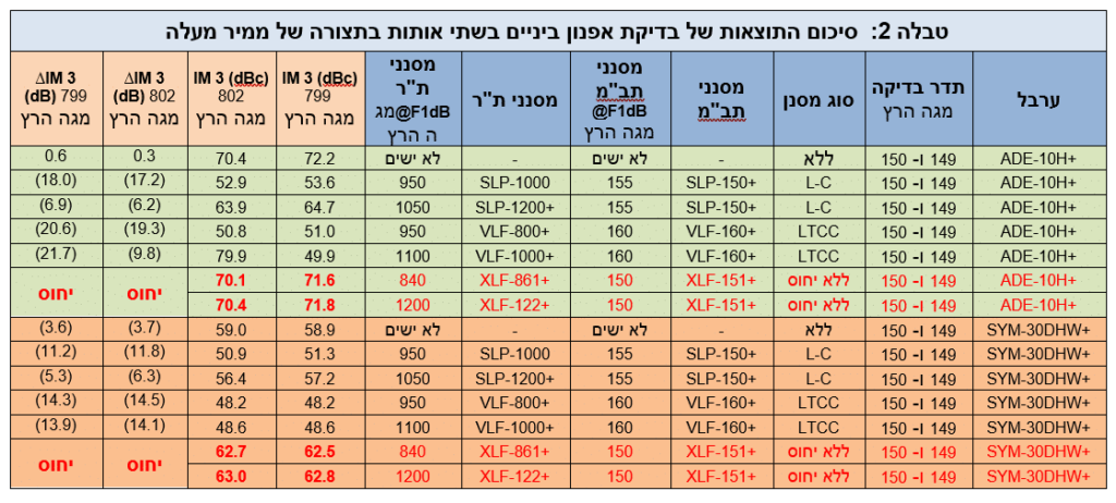 כל אחד משני הערבלים נבדק (1) ללא מסננים, (2) עם מסננים בעלי החזרות (מסננים עם רכיבים בדידים ומסנני LTCC) ו (3) עם מסננים ללא החזרות בחיבורי כניסת התב”ם ויציאת הת”ר. תדירויות אפנון ביניים מסדר שלישי, נמוכות וגבוהות, נמדדו ביציאת הת”ר בכל המקרים ועברו השוואה. סיכום התוצאות מוצג בטבלה 2. למען הקיצור, התוצאות המוצגות כאן הן עבור יציאת ת”ר של 800 מגה הרץ בלבד. התוצאות עבור יציאת ת”ר של 2,200 מגה הרץ דומות, ואפשר לקבל אותן מחברת          Mini-Circuits על ידי הגשת בקשה.