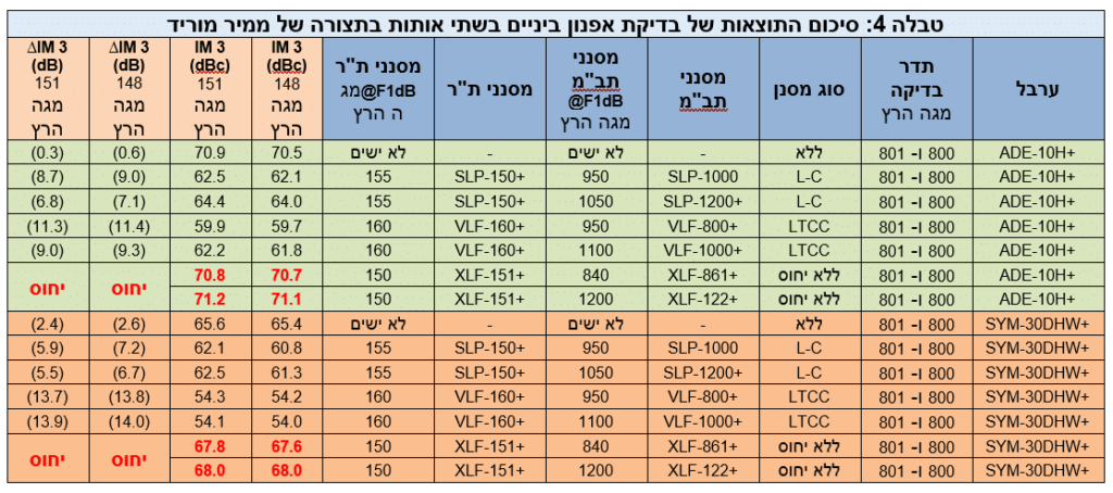 התדירות הנמוכה והגבוהה מסדר שלישי של אפנון הביניים נמדדו ביציאת התב”מ עבור כל המקרים ועברו השוואה. סיכום התוצאות מוצג בטבלה 4. שוב, למען הקיצור, התוצאות המוצגות כאן הן עבור כניסת ת”ר של 800 מגה הרץ בלבד, אבל כניסת ת”ר של 2,200 מגה הרץ הפיקה תוצאות דומות.