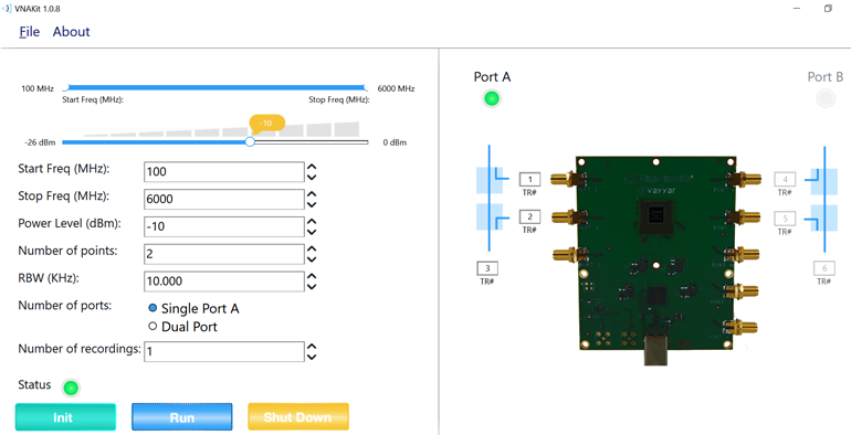 So, what does the UVNA-63 kit consist of? Foremost is the transceiver board, which houses the transceiver system-on-chip (SoC) developed by Vayyar. The transceiver board has multiple ports, providing the transmit and receive functionality needed to create a VNA. The board connects to a PC via a USB cable.