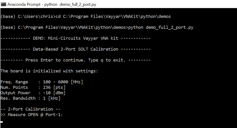 The company does offer some example code to help students get started. For example, the demo_full_2_port Python script is a good place to begin (Fig. 4). Executing this script will first configure the VNA settings, which includes a frequency range of 100 MHz to 6 GHz along with 236 measurement points.