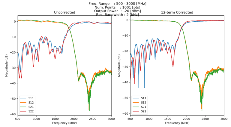 In addition to the touchstone files, uncorrected and corrected measurements are plotted side by side. Figure 6 shows the plots generated when measuring the VLF-1500+ lowpass filter with a modified version of the demo_full_2_port Python script. In this case, the default settings for the frequency range, number of points, output power, and resolution bandwidth have all been changed. Note that the uncorrected plots reveal a fictitious insertion loss of greater than 0 dB throughout the passband.