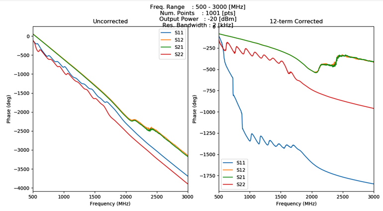 Users are then prompted to perform a two-port calibration to allow for the construction of a 12-term error model (Fig. 5). The script subsequently prompts users to measure the DUT. After the DUT is measured, two touchstone files that contain the measurement data are saved to a directory. One of the touchstone files contains the uncorrected S-parameters, while the other reveals the corrected S-parameters.