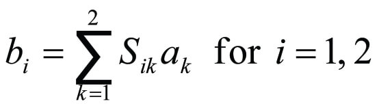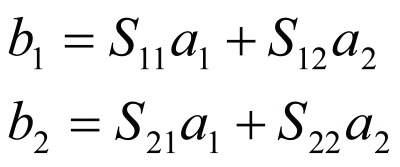 Starting with Eq. 2, b1 and b2 are the “reflected” voltage waves flowing out of ports 1 and 2, respectively, from a 2-port device, defined in terms of the S-parameters and the incident voltage waves a1 and a2. The indices 1 and 2 are port indices and all parameters are frequency dependent. This is a linear equation set and no new frequencies are generated and the “mapping” is assumed to be amplitude independent. The S-parameters are measured as ratios between reflected and incident waves, typically using a vector network analyzer, with no need to know the exact absolute power level of any of the waves.