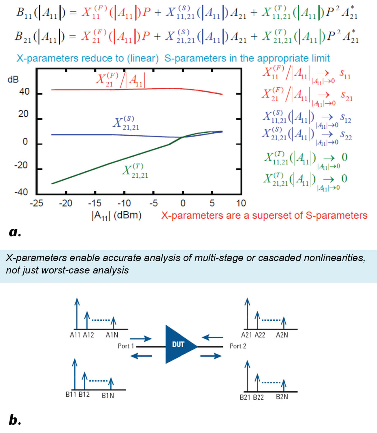 Whereas a deep dive on the mathematical formulation of X-parameters is beyond our scope here it may be helpful to review in brief one of the main defining equations shown below in Eq. 1.