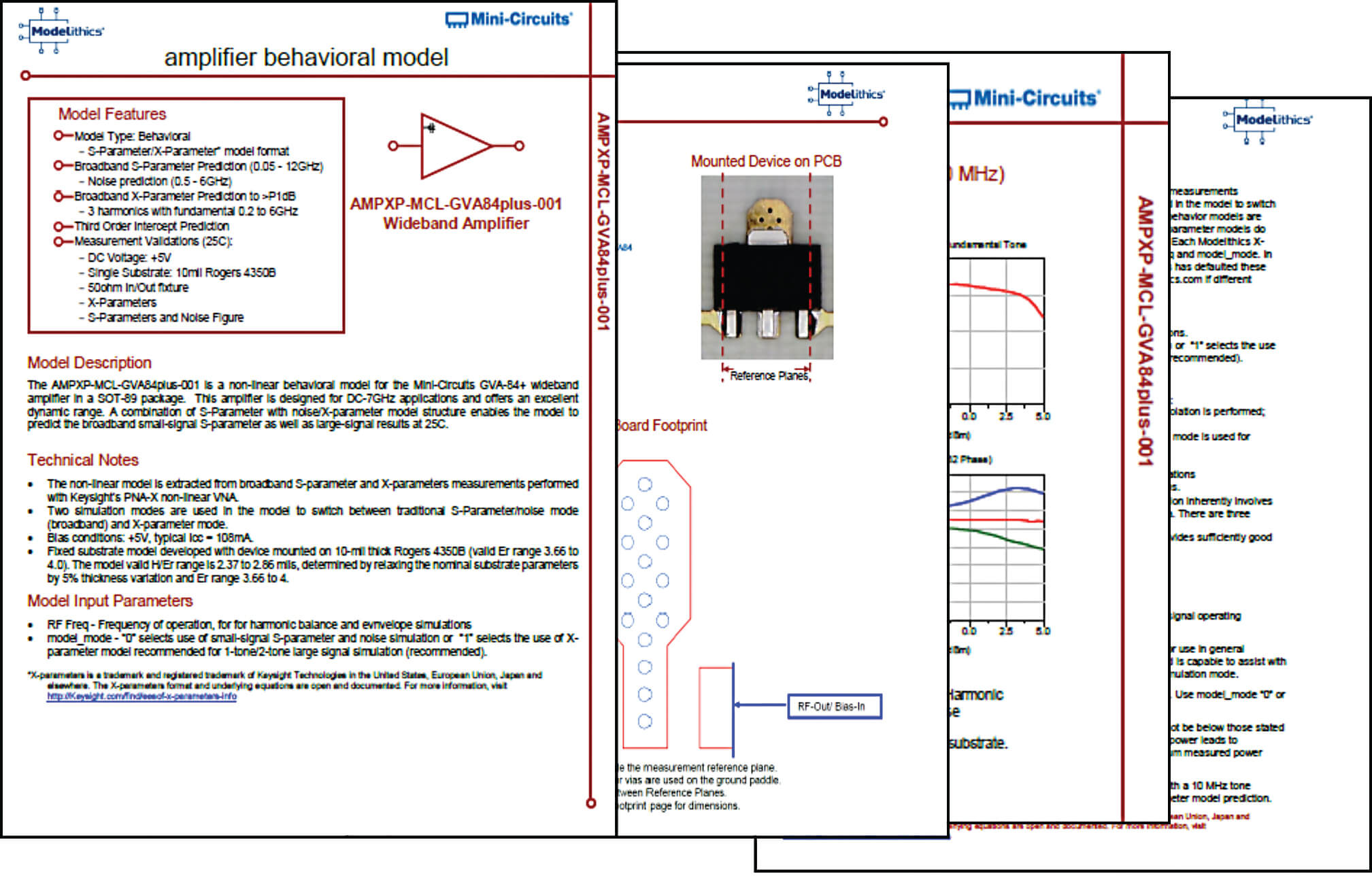 We now turn to presenting a few examples of X-parameters models selected from Table 1. We will start with the GVA-84+ model. Figure 3 illustrates some Modelithics data sheet information for this amplifier model.