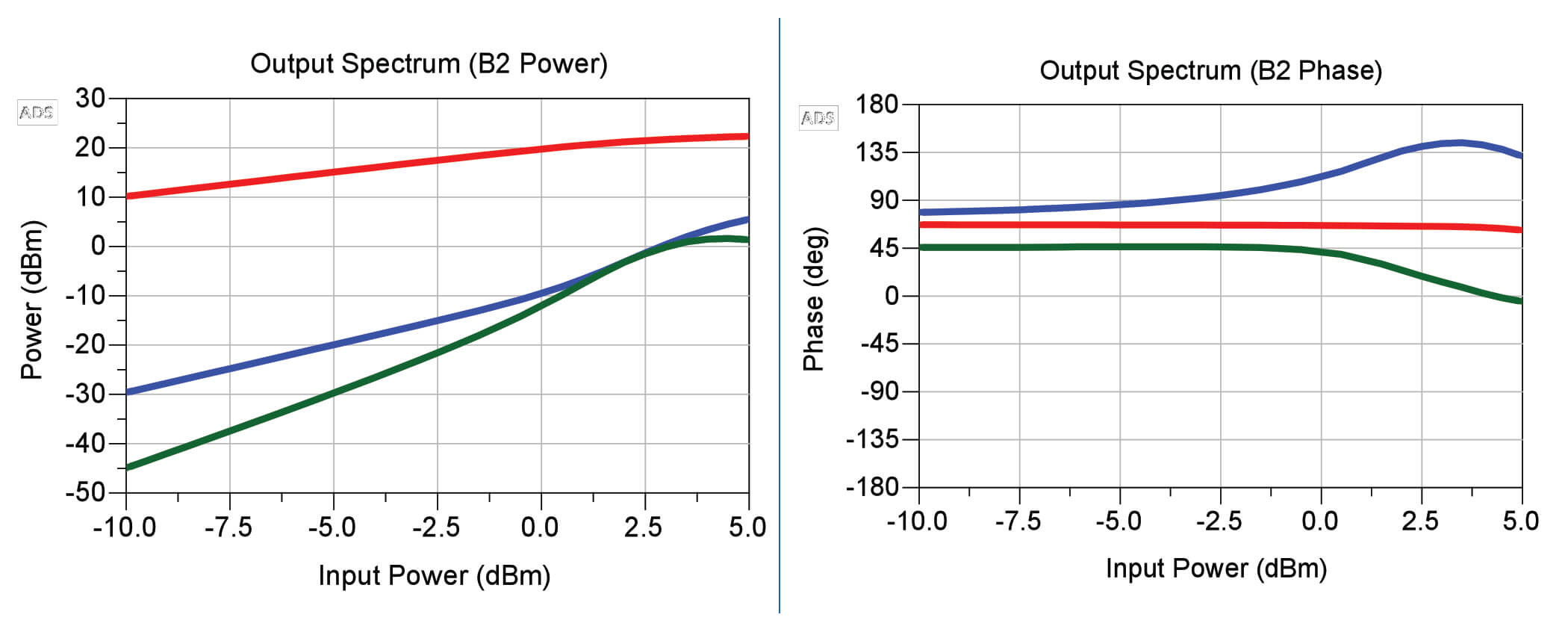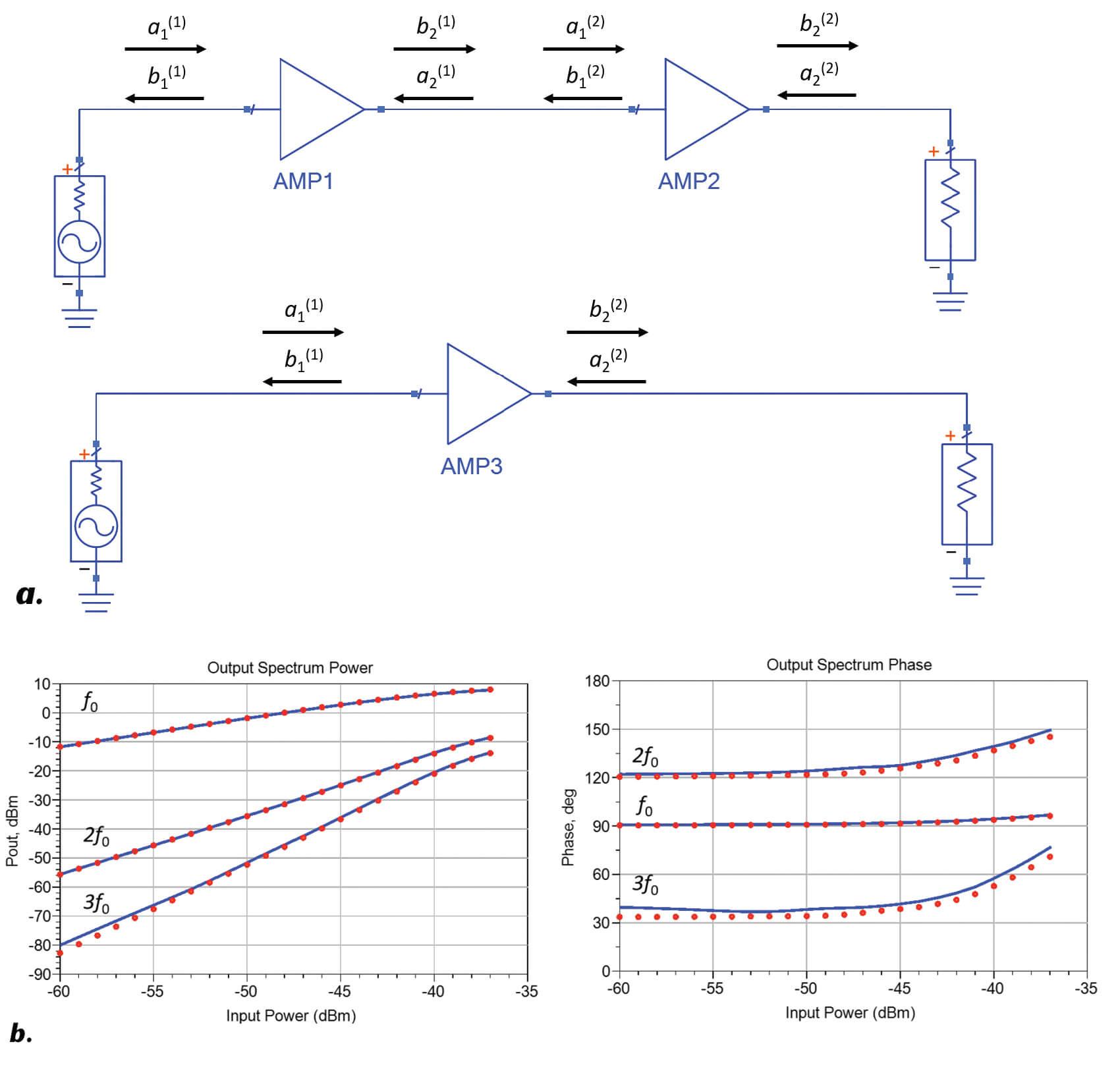 When it comes to modeling, among the most advanced models available for nonlinear simulations is the X-parameter* model , , . This is conveniently supported within Keysight Advanced Design System (ADS) and Genesys. Another model that is available and predates X-parameters is the P2D model , . Both are behavioral models that are particularly useful for modeling productized die and packaged integrated circuit amplifiers, for which internal schematic details may not be available to the modeler. In the following treatment, examples of both models are discussed with an emphasis on the more powerful and accurate X-parameter model. X-parameter models can be generated either from an ADS nonlinear circuit simulation or from measurements taken on a suitably equipped test bench, such as one equipped with a nonlinear vector network analyzer (NVNA) like the Keysight PNA-X. Our focus in this article will be on measurement-generated models.