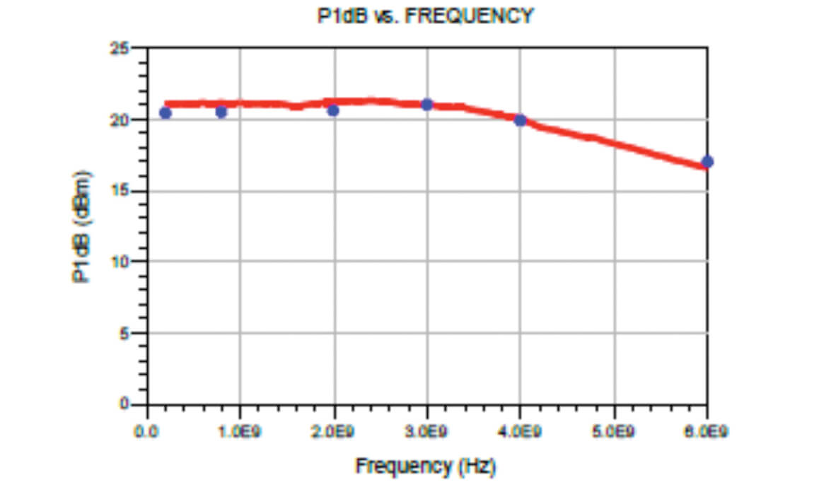 The results of using a somewhat more involved simulation setup for P1dB calculate across a range of frequencies are shown in Figure 6, with excellent correlation to the independently measured manufacturer’s P1dB data for this part.