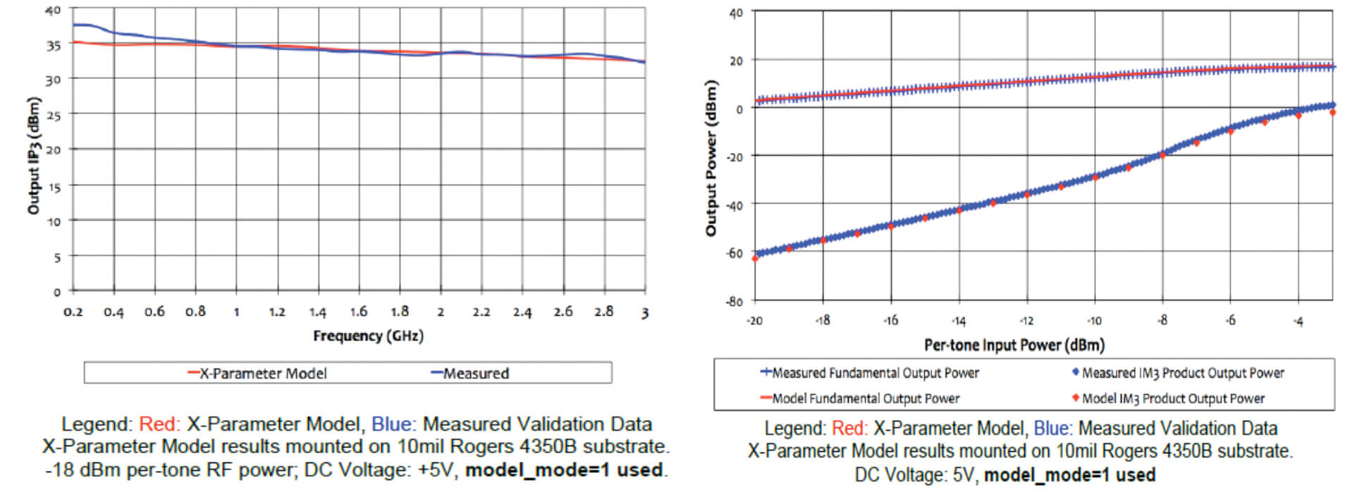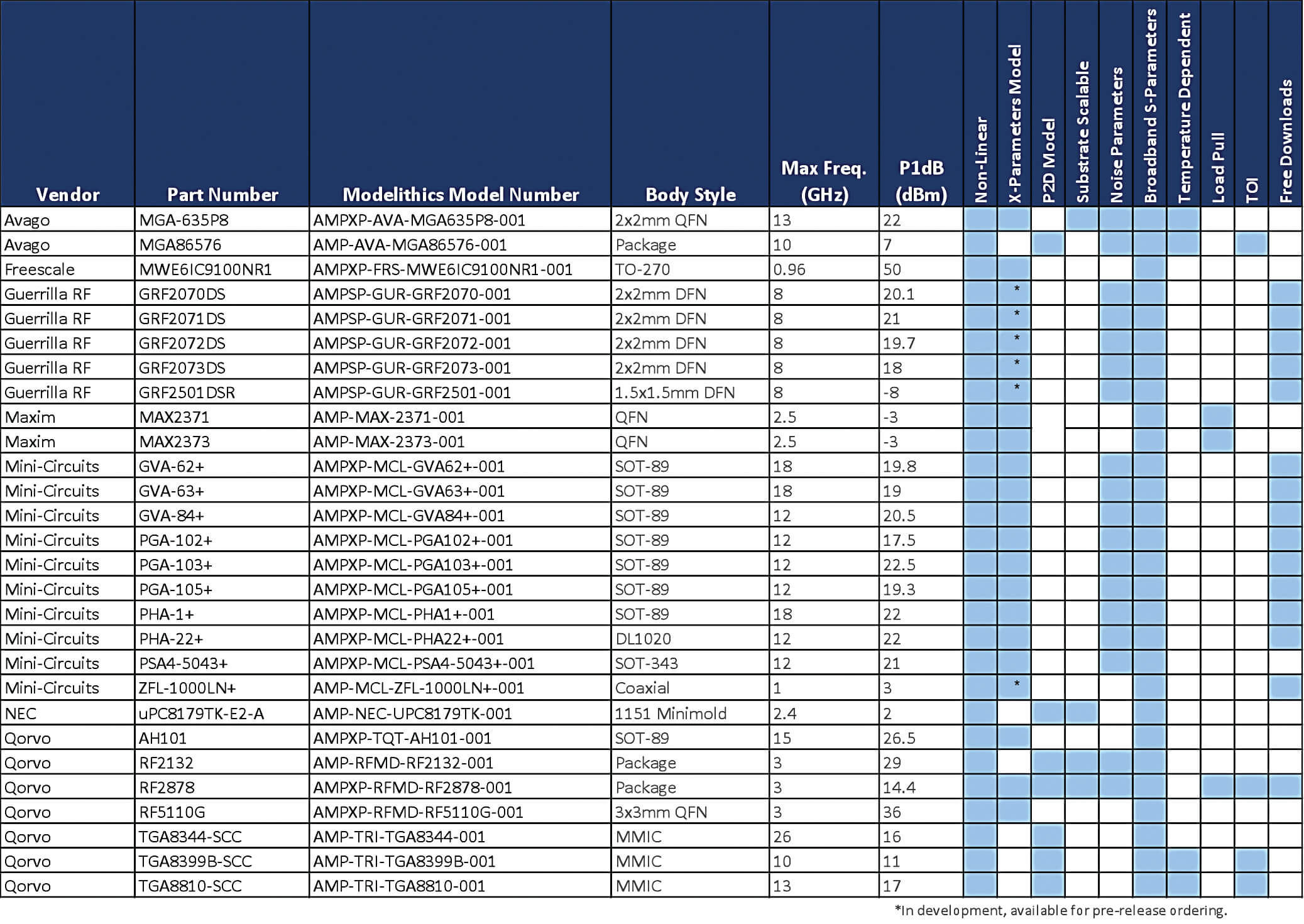 A library of advanced nonlinear models for a range of amplifier products is available for use in Keysight ADS. Advanced features include accurate de-embedding to device or package terminals with the same model being usable for broad-band linear and noise (where applicable) simulations as well as harmonic balance and envelope domain simulations enabled primarily by X-parameters technology. X-parameters are an excellent model solution for amplifier modeling. Among other reasons it requires little or no detailed internal device information and allows the amplifier to be treated as a black box. When extracted properly, the result is a model that can be used for multi-stage nonlinear analyses and design optimizations of individual amplifier output or inter-stage matching circuits.