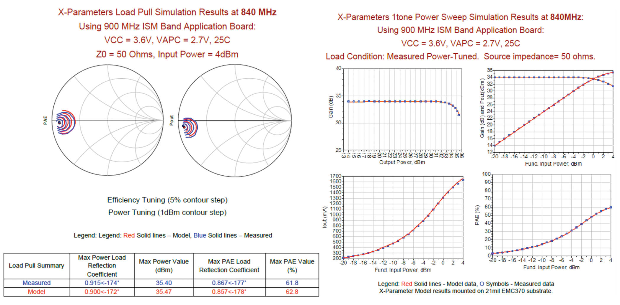 A few pages from the model information data sheet for the RFMD (now Qorvo) RF5110G amplifier are shown in Figure 9. As compared to the GVA-84+ amplfier described above, this part is a high efficiency, high gain power amplifier capable of over 3W of output power. The output is left unmatched so that the designer can optimize for his chosen bandwidth. The Modelithics model for this part can accurately simulate S-parameters over 0.1 to 3GHz (model_mode =0), while the nonlinear model (model_mode=1), operates at a subset of these frequencies. The model is actually extracted for applications in three bands, selected with a band select pull down menu. A manufacturer suggested application circuit was implemented for each band on custom test boards manufactured along with on-board calibration standards to de-embed the 50 ohm input/output transmission lines to the package edge. Excellent agreement is seen between simulated and measured results for load-pull countours and power swept gain, power and PAE are shown in Figure 10.