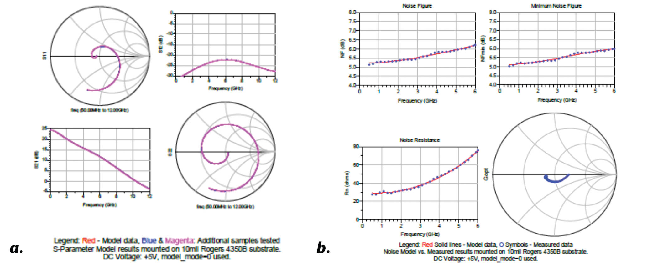 Figure 4. S-parameters (a.) and noise parameters (b.) simulation and measured results for GVA-84+ model using model_mode=0 setting and appropriate linear ADS simulation schematics.