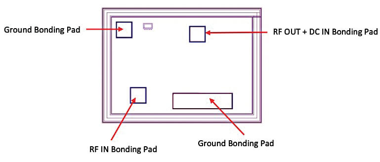 Figure 2 shows the bonding pad layout of Mini-Circuits amplifier die model PHA-1H-DG+. Note that the RF ports on this model do not have ground-signal-ground pads, making it impossible to measure the die performance directly via die probe.