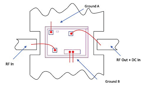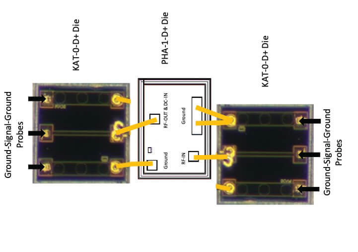 For DUTs without ground-signal-ground pads, some or all of the ground wires are omitted depending on the die design, and the rest of the process is the same as above. The amplifier die from Figure 2 (PHA-1-D+) is shown in Figure 7 with KAT-0-DG+ dice wire bonded to the RF input and output ports. Here, the addition of the thru-line die includes the effects of wire bonds on the DUT performance and also essentially functions as an adapter between the DUT pad configuration and the ground-signal-ground terminal configuration of the die probe. This eliminates the need for custom PCB design and fabrication, saving significant time and cost.