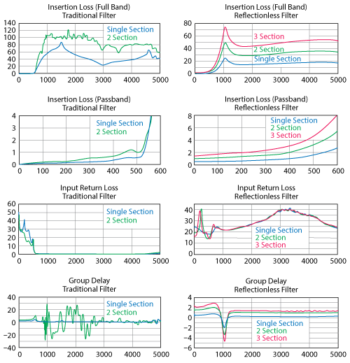 As another extension, cascading filters are used in many applications to enhance stopband rejection or to combine highpass and lowpass filters to create a bandpass response. While cascading traditional filters can introduce in-band ripple and phase instability, reflectionless filters can be cascaded without adding these effects to the filter’s performance. Figure 4 compares the typical insertion loss, return loss and group delay of a traditional filter to that of a reflectionless filter when cascaded. These curves show that cascading traditional filters creates in-band ripple, degrades return loss and generates phase instability. By contrast, the reflectionless filters exhibit none of these detrimental effects, even when cascaded in three sections.