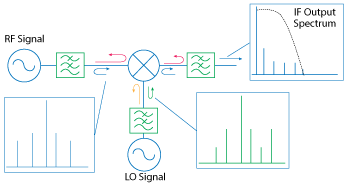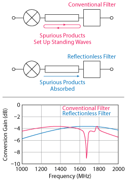 Reflectionless filters are particularly useful for pairing with sensitive nonlinear devices, where traditional filters are notoriously problematic. One such case is a filter cascaded with a mixer in the signal chain. Mixers generate spurious mixing products, higher LO harmonics and other unwanted signals that must be filtered out. However, with a conventional filter, these spurious tones are reflected back into the mixer where they can convert again or re-mix with the intended signals to create a multitude of unintended signals that may fall within the desired passband (see Figure 5).