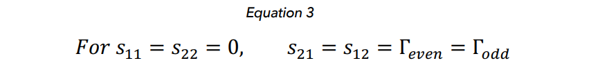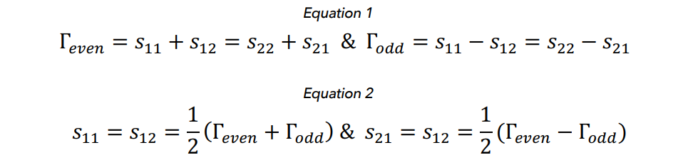Under these conditions, two separate single-port networks can be drawn, each with only half the elements of the original two-port network with the nodes along the symmetry plane either shorted to ground or open (odd-mode circuits and even-mode circuits). Hence, the scattering parameters of the two-port network can be derived from the superposition of the reflection coefficients of the two circuits detailed in Equations 1 and 2.