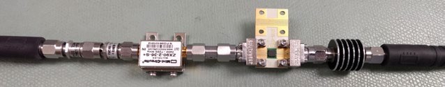 The tests were conducted using an Agilent E8257D PSG signal generator and an Agilent U2000A power meter. The doubler used in all tests was a Mini-Circuits ZX90-2-36-S+. The second doubler was a KSX2-24+. The amplifier used in the multiplier chain was a GALI-39+. The conventional filter was a Mini-Circuits VLF-6400+, and the reflectionless filter was a Mini-Circuits XLF-662M+. Each test was done using four different lengths of interconnect between the connectorized doubler and filter: no cable, a 6-inch coaxial cable, a-12 inch coaxial cable, and a 36-inch coaxial cable. An image of the test setup of the doubler-filter pair is presented in Figure 15.