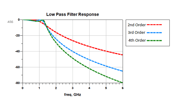 An ideal low pass filter should pass all signals with frequencies lower than the cut-off frequency and attenuate all signals with frequencies higher than the cutoff frequency. The level of attenuation for each frequency depends on the filter design and order. We don’t live in an ideal world, however, and an ideal filter does not exist in practice. The performance of a filter will always be affected by factors such as dielectric loss and the conductivity of metallic materials used in the circuit.