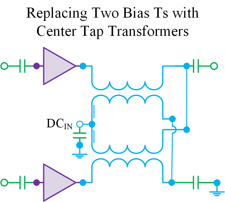 Moreover, if a DC current is required for a subsection of a circuit, a specialized RF transformer can be used to inject DC current into the signal path. For example, two center tapped transformers can be used to inject a DC bias, replacing the need for two Bias Ts (see Figure 9).