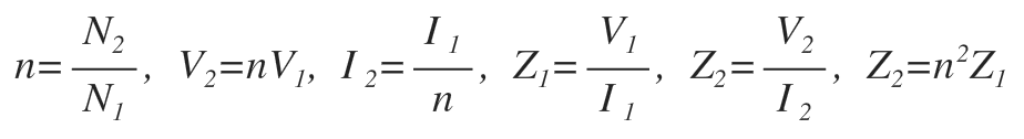 Hence, the secondary impedance is a function of the square of the windings ratio times the impedance of the primary (Equation 1). Where I1, V1, and Z1 are the current, voltage, and impedance through the primary winding; I2, V2, and Z2 are the current, voltage, and impedance through the secondary winding, N1 is the number of turns in the primary winding; N2 is the number of turns in the secondary winding; 1 and 2 are the input ports of the primary winding; and lastly, 3 and 4 are the output ports of the secondary winding.