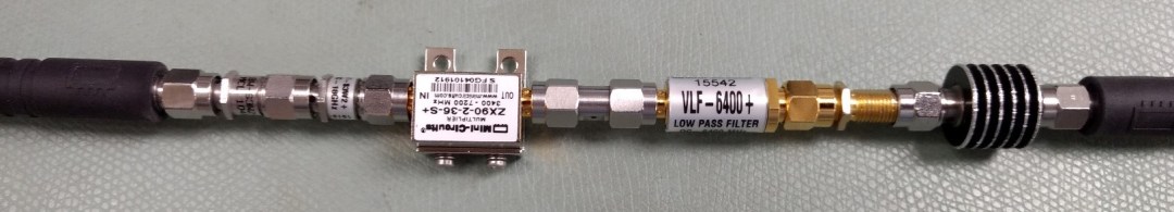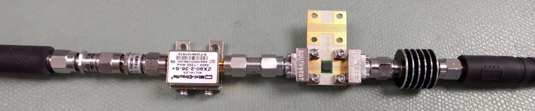 The tests were conducted using an Agilent E8257D PSG signal generator and an Agilent U2000A power meter. The doubler used in all tests was a Mini-Circuits ZX90-2-36-S+. The second doubler in the 4X multiplier chain was a KSX2-24+. The amplifier used in the multiplier chain was a GALI-39+. The conventional filter was a Mini-Circuits VLF-6400+, and the reflectionless filter was a Mini-Circuits XLF-662M+. Each test was done using four different lengths of interconnect between the connectorized doubler and filter: no cable, a 6-inch coaxial cable, a-12 inch coaxial cable, and a 36-inch coaxial cable. An image of the test setup of the doubler-filter pair is shown in Figure 3.