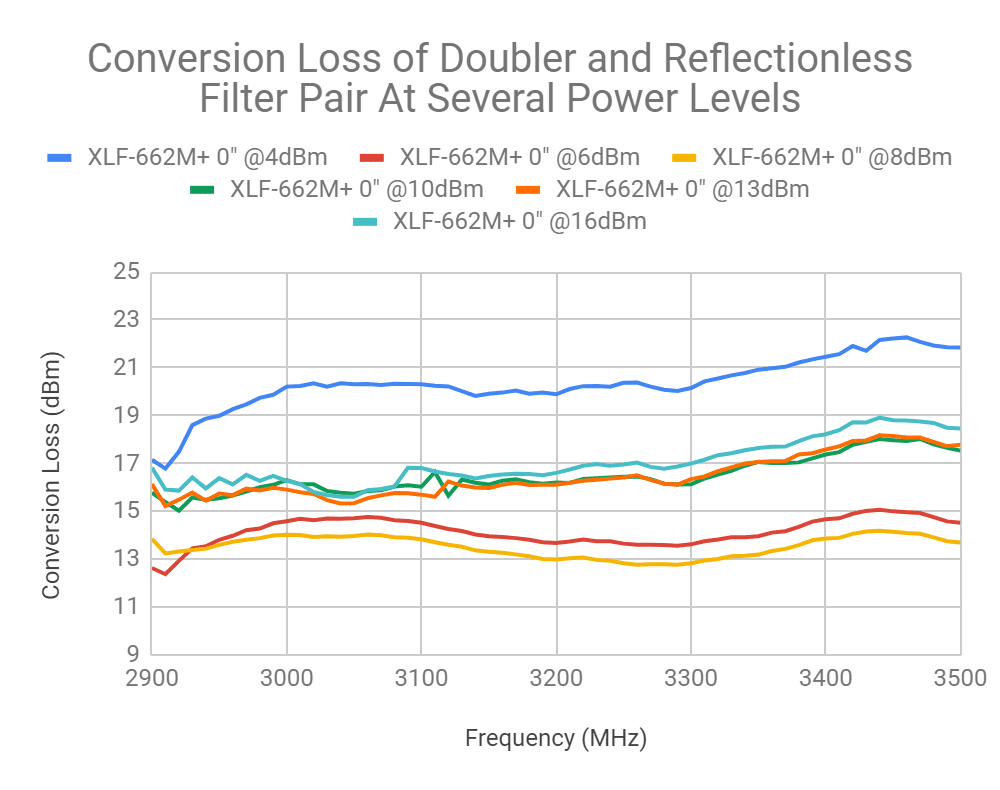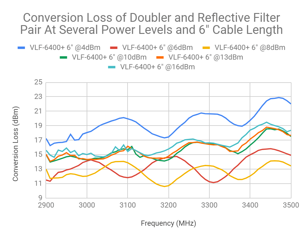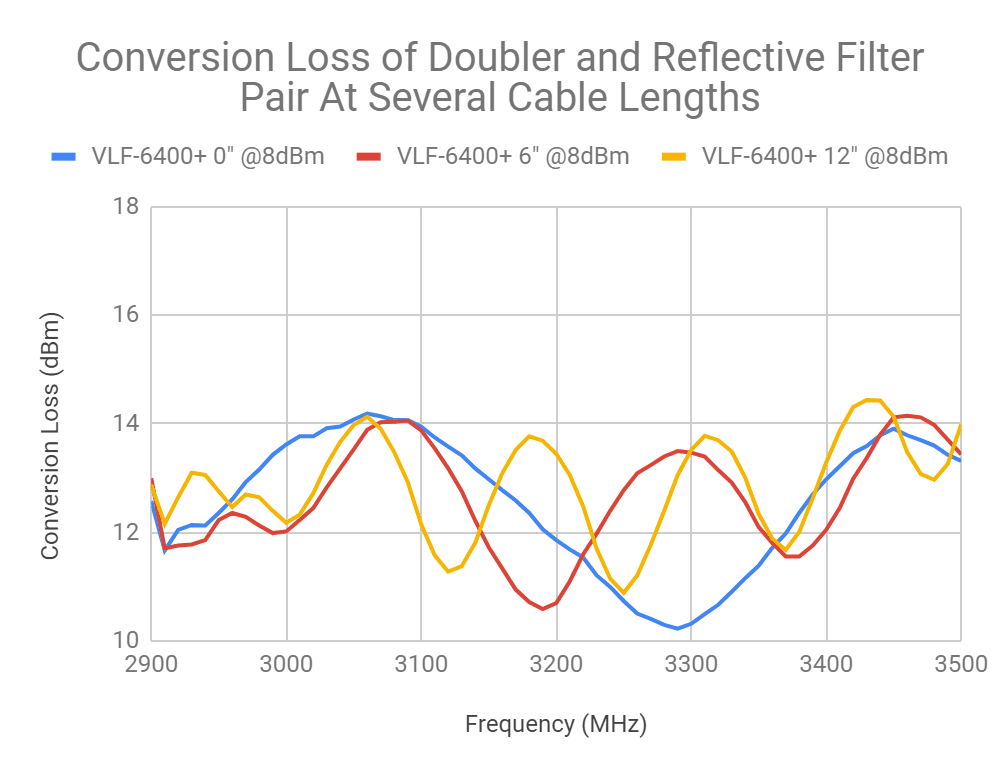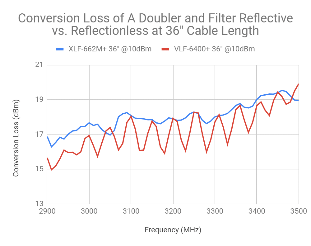 Figure 6 captures the susceptibility of a doubler-filter pair to effects created by filters with out-of-band impedance mismatch that can worsen the standing waves. Even in the worst case experimental example (a 36” transmission line extension), the reflectionless filter (top) only develops a marginal conversion loss ripple, while the ripple of the reflective filter (bottom) is over 2 dB. A side-by-side comparison of the conversion loss ripple for both the reflective and reflectionless filter is provided in Figure 7 (top).