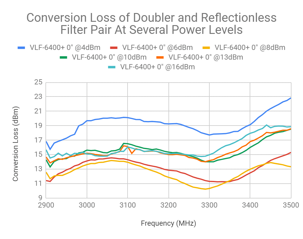 Results of the two experiments are shown in Figures 4, 5, 6 and 7. Figure 4 shows the conversion loss of a doubler-filter pair at various power levels with a reflectionless filter (top) and a reflective filter (bottom). The plots in Figure 4 show that even at nominal power levels for the doubler, the reflective filter’s out-of-band impedance mismatch leads to reflections of the harmonics, especially the 3rd harmonic, which creates greater conversion loss ripple. Figure 5 exaggerates this point by replicating the same experiment, but with a longer transmission line length (6 inches) between the filter and doubler, allowing for greater development of standing waves. Figure 5 shows that the reflectionless filter (top) is able to effectively attenuate the out-of-band reflections with almost no additional conversion loss ripple, while the reflective filter exhibits standing wave effects that worsen with the length of the transmission line used.