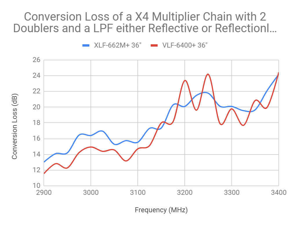 Lastly, in Figure 7 (bottom) an X4 multiplier chain is tested using two doublers with a filter after the first doubler. This plot shows that the conversion loss ripple under worst-case conditions (extended transmission line) is greater for the reflective filter than the reflectionless filter by over 3 dB peak-to-peak. In order to achieve comparable conversion loss ripple with a conventional filter to that of a reflectionless filter, a much higher power amplifier and an extra attenuator would be necessary to push the doublers well into saturation and mitigate the standing wave generated by the higher power level. In longer multiplier chains, the reflective nature of conventional filters may degrade conversion loss flatness even further, which necessitates careful selection of amplifiers and attenuators distributed throughout the multiplier chain, adding size, cost and complexity to the system. By contrast, a well-chosen amplifier with a reflectionless filter can achieve flat conversion loss efficiency while minimizing cost, size and the need for extra components.