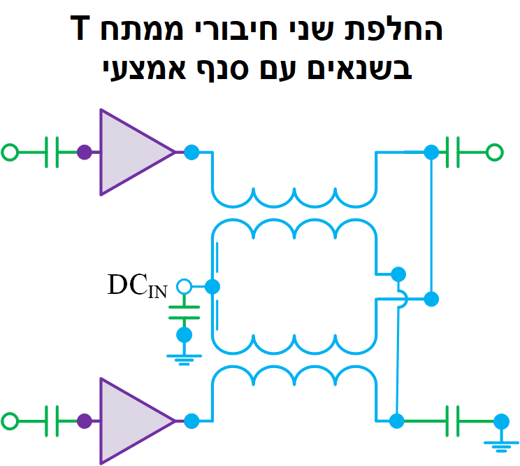 מעבר לכך, אם זרם ישר נדרש לתת-מערכת של מעגל, שנאי ת”ר ייעודי יכול לשמש כדי להזריק את הזרם הישר לתוך נתיב האות. לדוגמה, שני שנאים עם סנף אמצעי יכולים לשמש כדי להזריק ממתח במתח ישר, ולהחליף את הצורך בשני חיבורי ממתח T (Bias T) (עיין באיור 9).