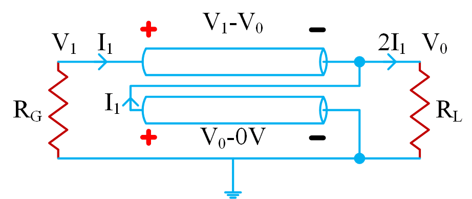 שנאי קו תמסורת בסיסי מורכב מקו תמסורת של שני מוליכים. המוליך הראשון מחובר מהמחולל אל העומס, והמוליך השני מחובר בין המוצא של קו התמסורת הראשון לבין ההארקה, כפי שנראה באיור 4. בתצורה זו, הזרם שעובר דרך העומס יהיה כפול מהזרם שעובר דרך המחולל ו- V0 הוא מחצית המתח V1. מכאן, שהתנגדות העומס היא רק רבע מההתנגדות שנראית בצד של המחולל, ונוצר שנאי של 1:4 (משוואה 2).