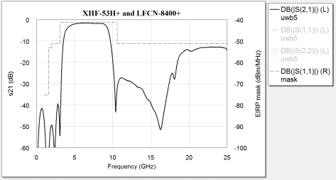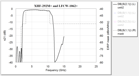 Overall, the filter approaches the desired response for real-world UWB transmission, but is still a little wider than ideal. A similar approach with the right combination of filters may come closer to the ideal filter behavior.