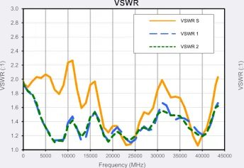 Another improvement was in the overall design of the leadframe itself. Specifically, the EM simulations showed unwanted coupling between pins, even if unconnected internally or grounded externally. This coupling substantially degraded high frequency response. The EP2KA+ two-way MMIC splitter (10 to 43.5 GHz) is a perfect example of this pin optimization approach. We started with the same package as the MGVA-82+ (DC to 5.2 GHz dual matched amplifier), and by selectively removing pins from the leadframe (Figure 5.), were able to measurably improve the input to output isolation, as well as the amplitude and phase unbalance. The leadframe bond pad optimization also improved input/output VSWR to better than 2:1 over the majority of the band (Figure 6.).