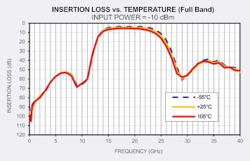 At mmW frequencies, confining the RF signal, and reducing unwanted coupling is a challenge, as described above. While the RF connections are often the focus of the design, the non-RF connections, if overlooked, also contribute to performance degradation at higher frequencies. There are times when these package contacts can’t be eliminated, so Mini-Circuits developed a patent-pending technique which takes advantage of these extra connections to isolate portions of the IC, improving the input to output frequency response. Our line of reflectionless high pass filters used this approach to achieve insertion loss as low as 0.7 dB up to 30 GHz, while maintaining excellent low frequency stop band performance (Figure 7).