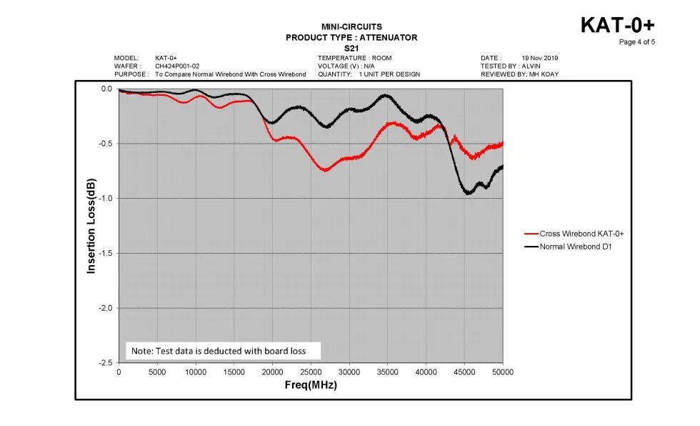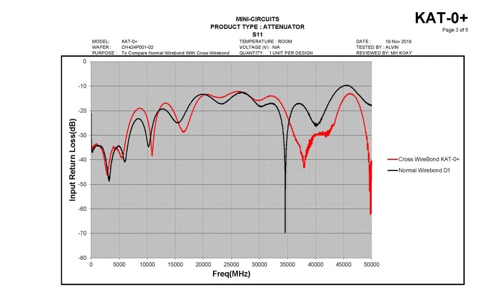 The KAT-series of precision attenuators is one example of Mini-Circuits’ patent pending bonding technique. Based on the YAT-series of 26 GHz attenuators, we were able to extend the desired frequency response to 43.5 GHz (released in late 2019 as KAT-x+). With further refinements, a new family of attenuators will be released in 2020 that will operate up to 50 GHz (Figure 3.) where both the insertion loss and return loss were measurably improved up to the 50 GHz band edge.