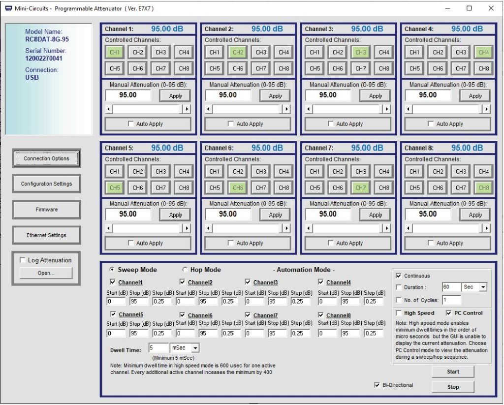 As for controlling the unit, all our digital attenuators come with user-friendly GUI software. With the help of the software provided, you can quickly manage all the attenuator’s parameters and visualize all the settings at a glance.